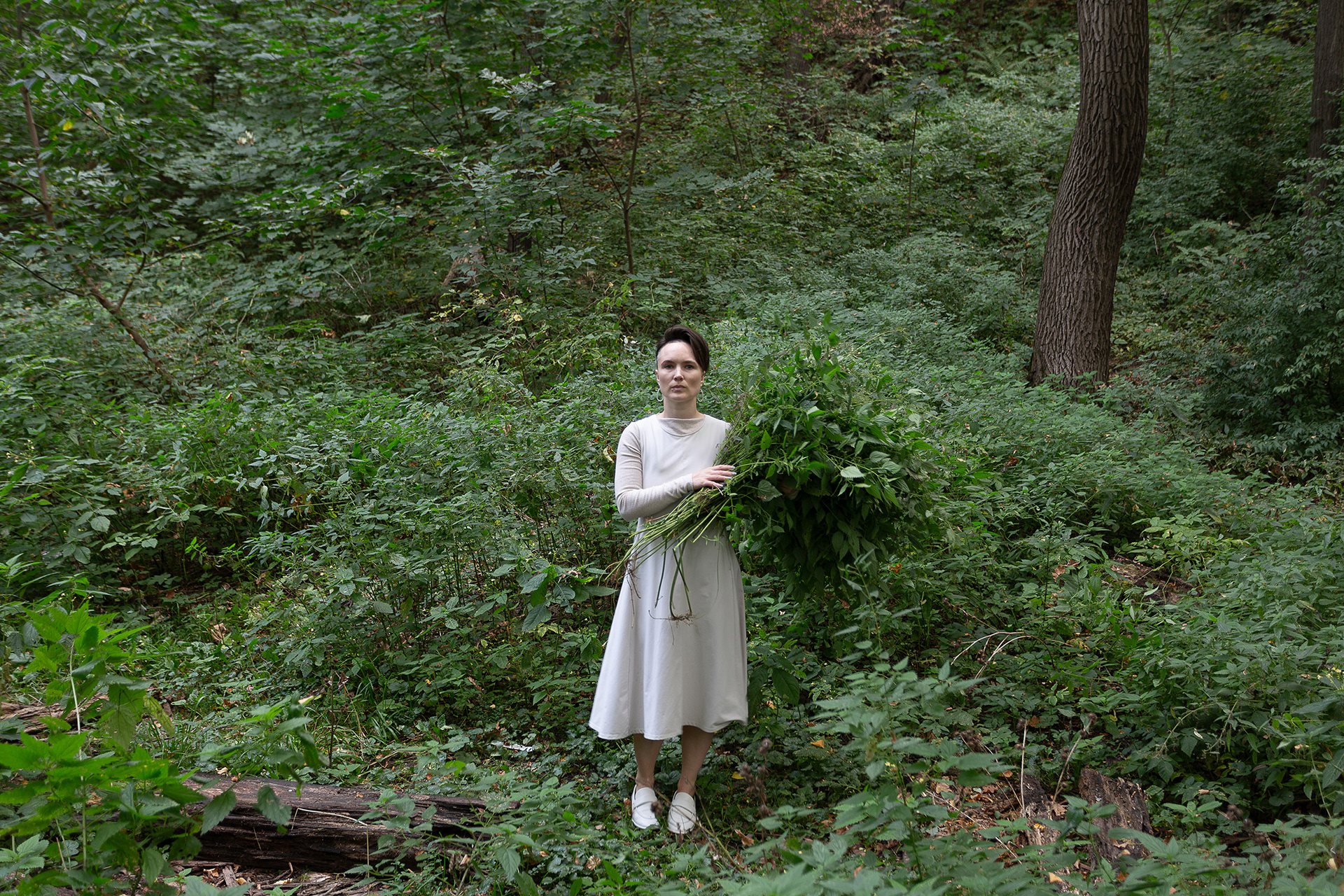 В перформансе «Путь» я вступаю в прямой контакт с крапивой, которая из «сорняка» превращается в активного участника действия. Разрывая заросли голыми руками, я понимаю: растение определяет мой темп, боль и паузы — учит меня вниманию и коммуникации.